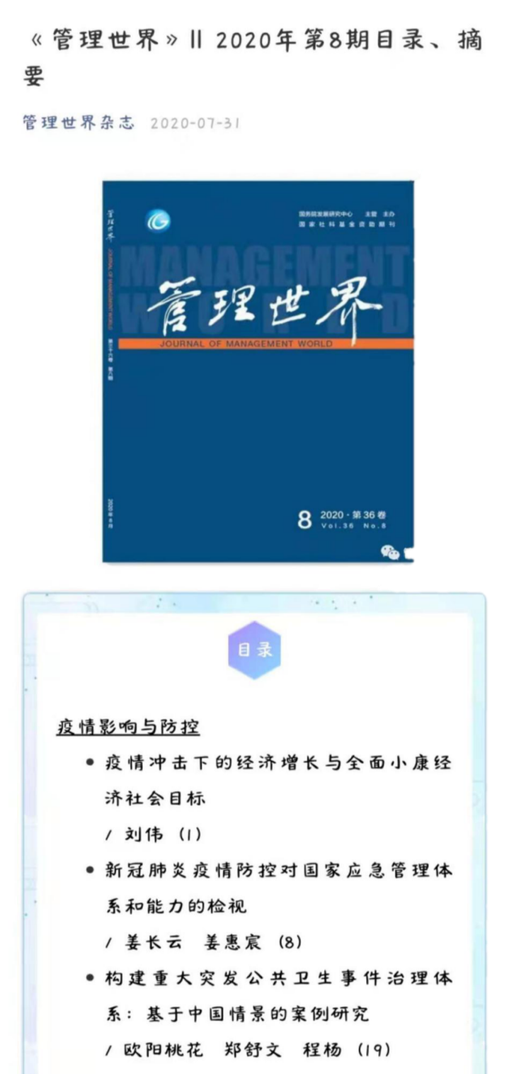 《管理世界》2020年第8期,发表了我院欧阳桃花教授团队在应对新冠疫情方面的最新研究成果《构建重大突发公共卫生事件治理体系:基于中国情境的案例研究》。欧阳桃花教授及其博士生郑舒文为第一作者,丹麦奥尔堡大学程杨副教授为通讯作者。同时该论文从《管理世界》2020年出版的12期共计184篇文章中脱颖而出,被评为年度优秀论文。